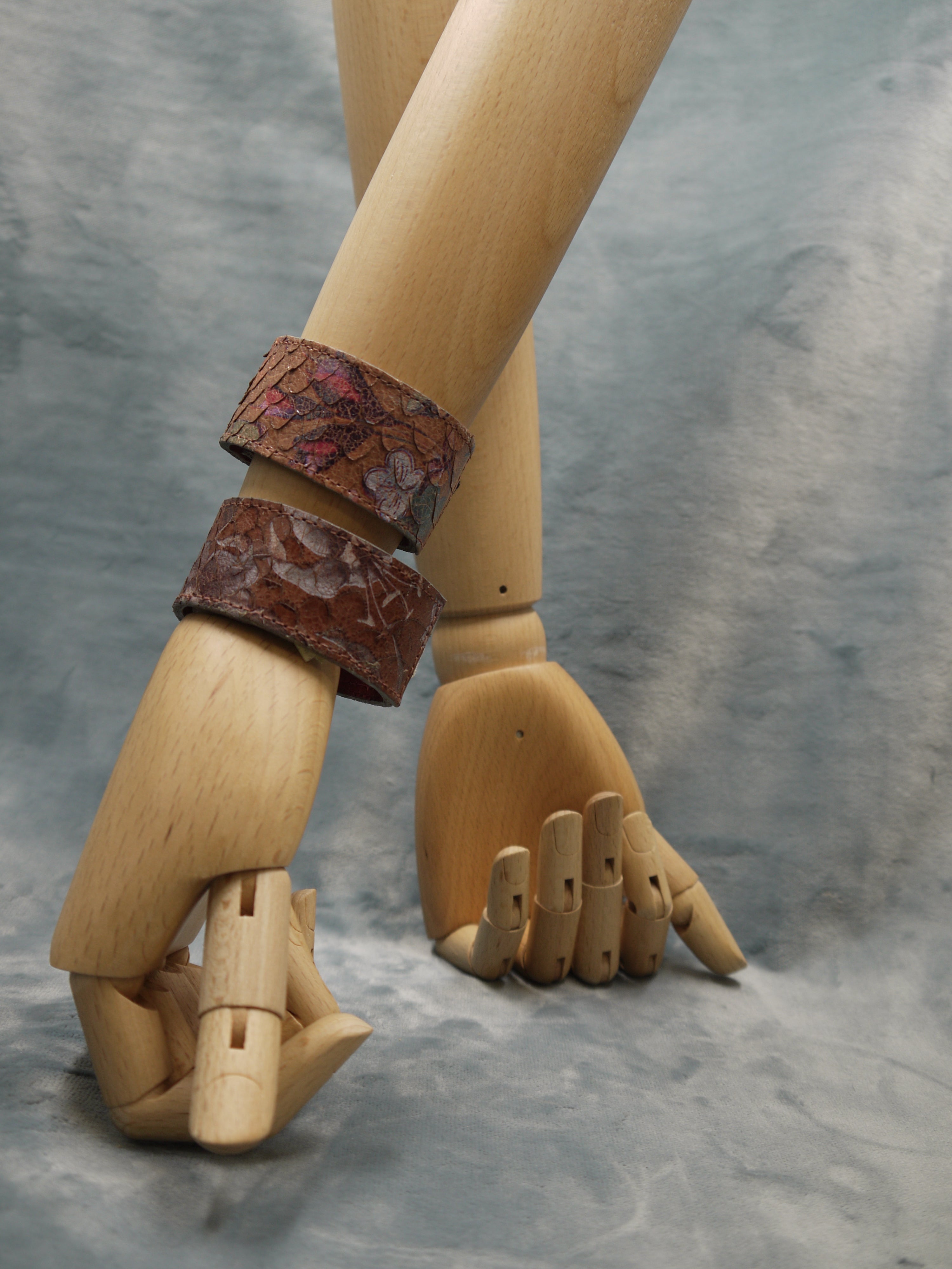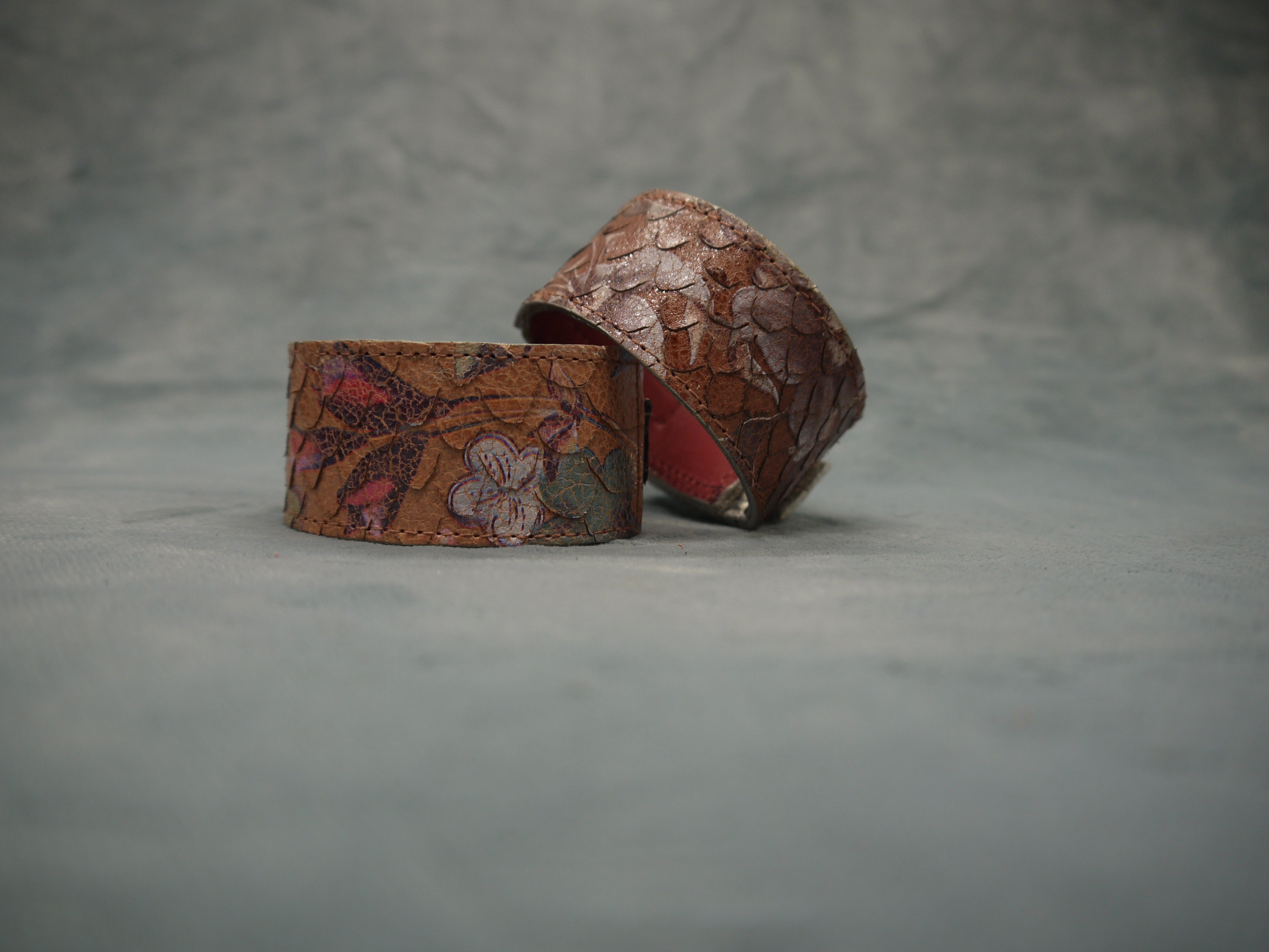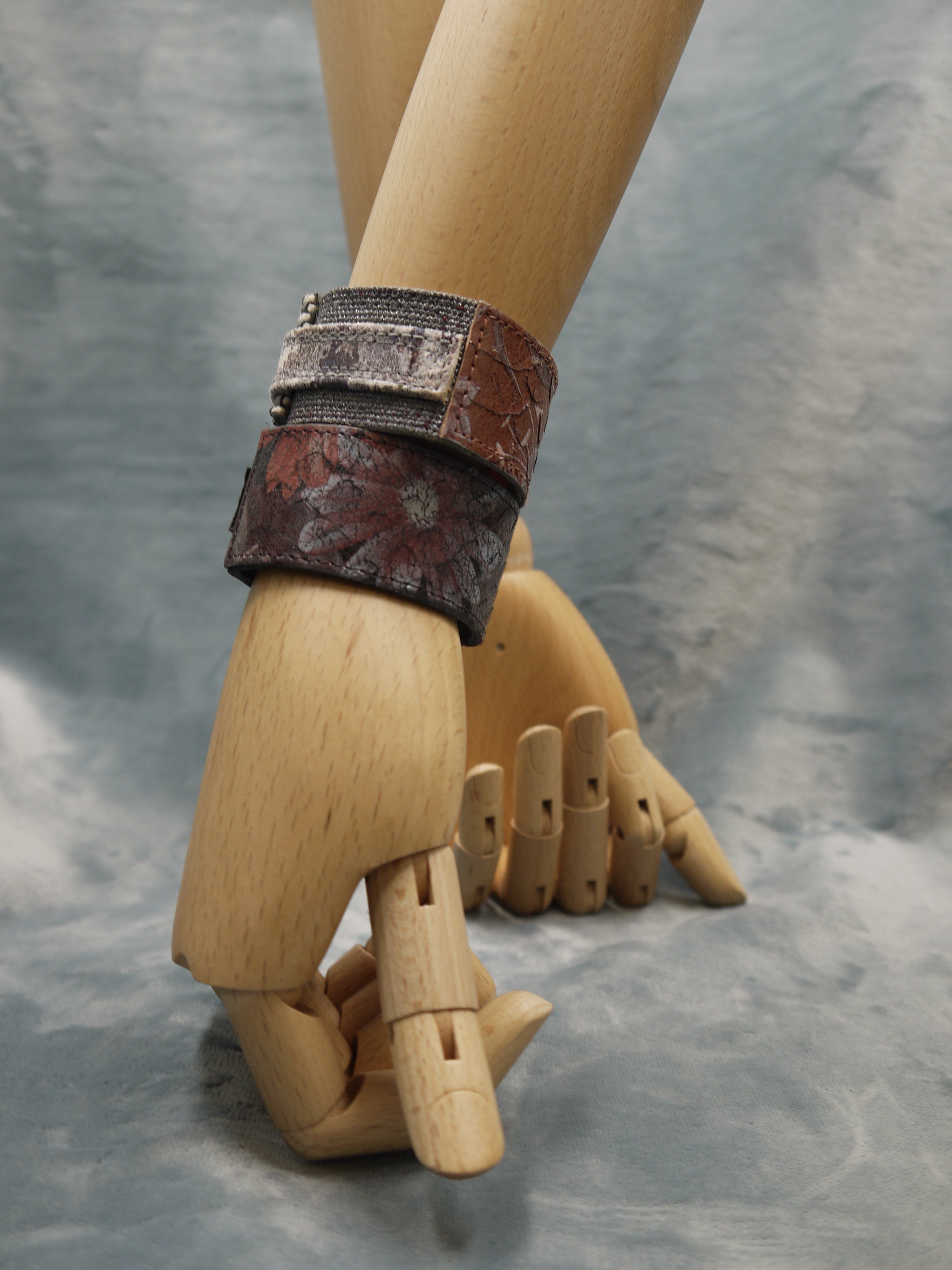 Slim Tan Floral Leather Cuff/Bracelet with Grey metallic overlapping design. The bracelet can be worn with the floral section at the front or with the overlapping clasp finish at the front! The choice is yours! Beautiful worn by itself or with other bracelets from the same range.