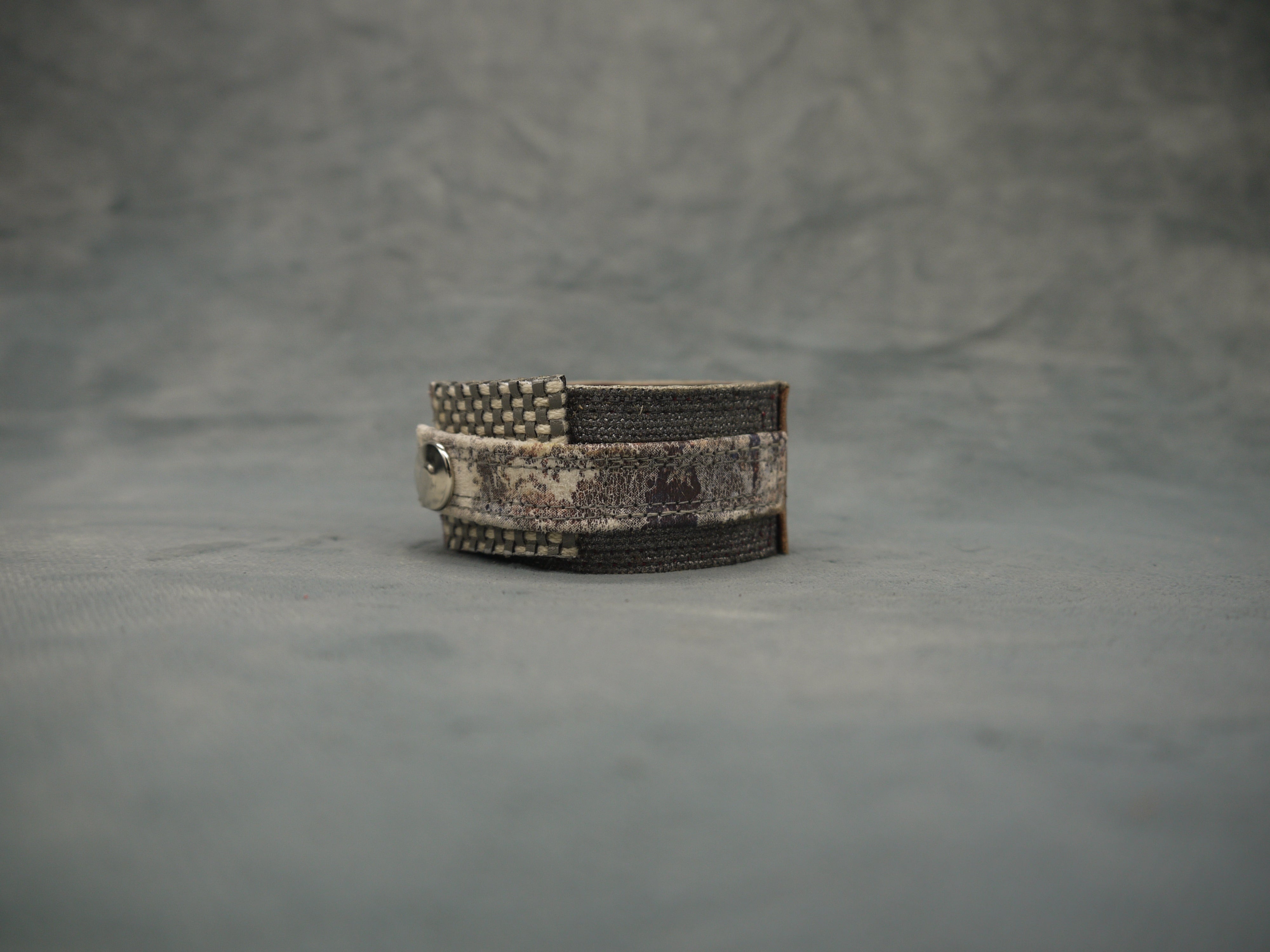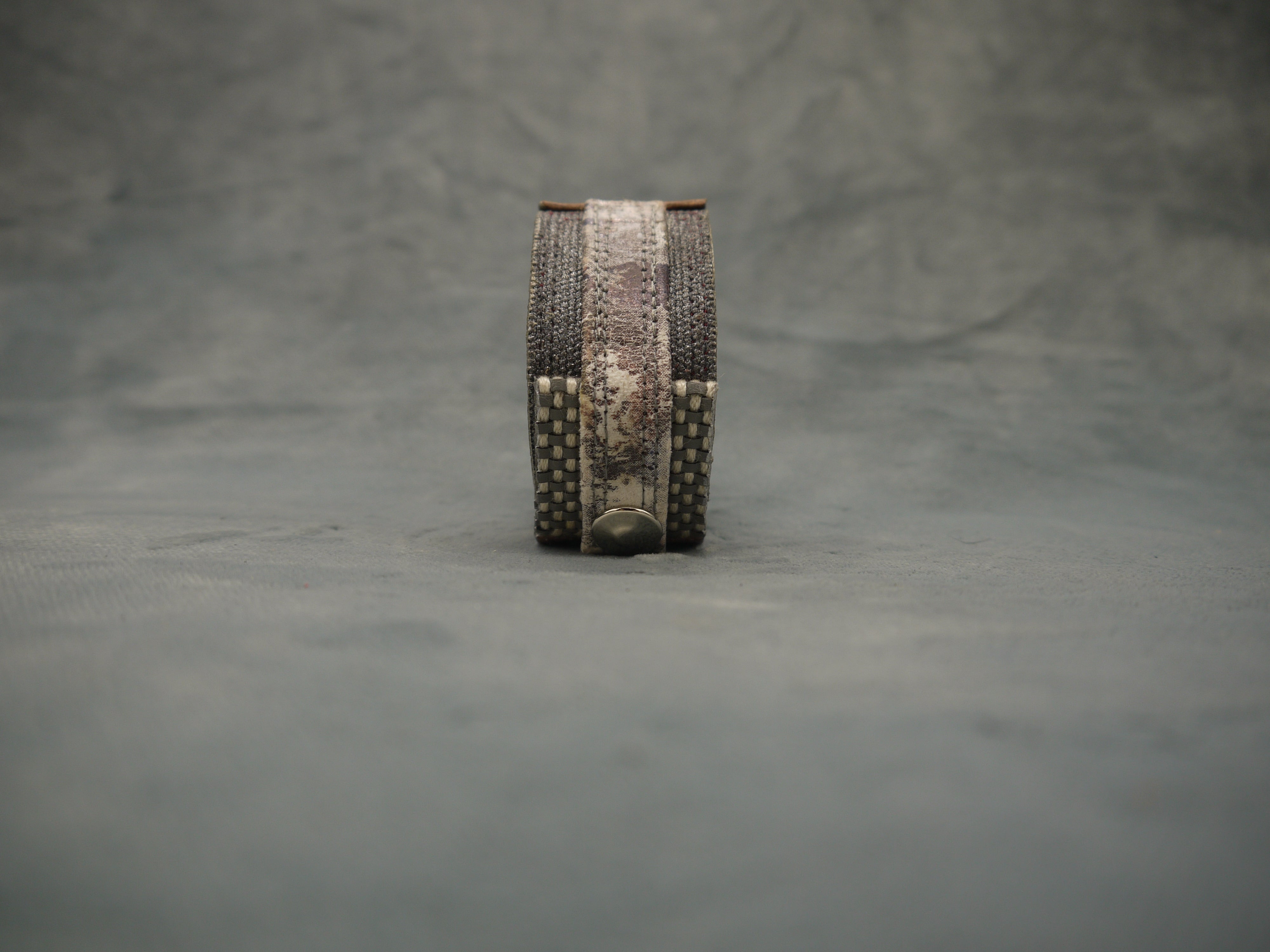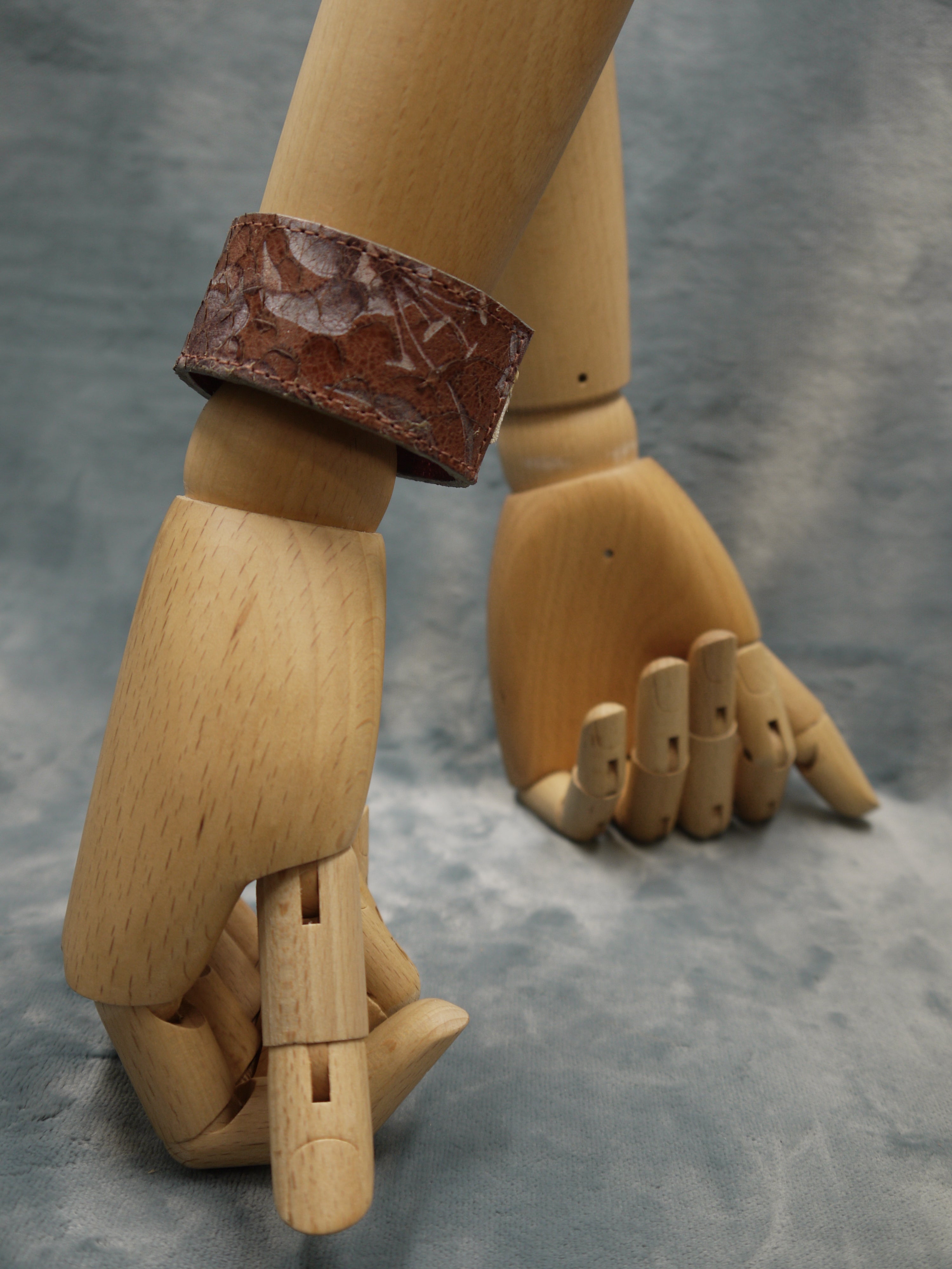 Slim Tan Floral Leather Cuff/Bracelet with Grey metallic overlapping design. The bracelet can be worn with the floral section at the front or with the overlapping clasp finish at the front! The choice is yours! Beautiful worn by itself or with other bracelets from the same range.